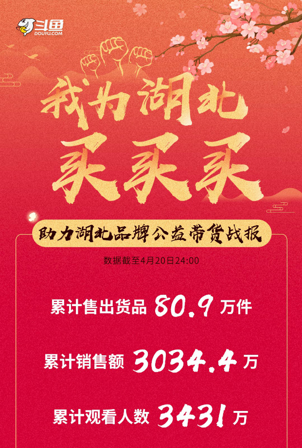 4月20日晚间,斗鱼(NASDQ:DOYU)“我为湖北买买买”助力湖北品牌公益带货收官,期间共售出湖北特产80.9万件,累计销售额3034.4万,直播间观看人数超过3431万。