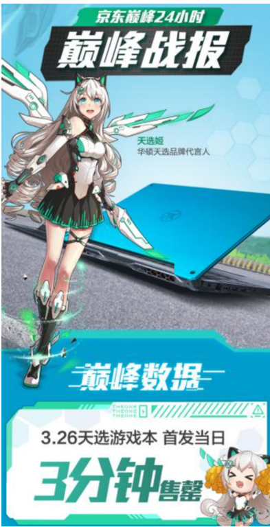 近期,华硕新品天选游戏本在京东首发当日3分钟内便售罄,24小时巅峰日更是斩获京东游戏本品类成交额、销量排行双冠,备受消费者青睐。这款游戏本正是京东凭借大数据洞察挖掘到华硕笔记本市场里的二次元强需求,联合华硕反向定制打造的新品,蓝绿配色潮流靓丽、性能也十分强悍,在定价6K档的同档位机型中,有着十足的性价比优势,正好迎合Z世代热衷二次元、追求产品颜值潮流时尚的新品消费观,一经发售便成“爆款”。