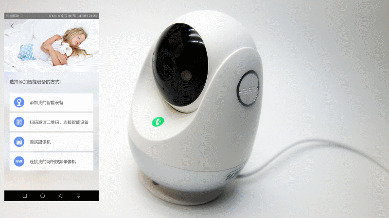 APP中设备添加方法非常简单,按照步骤提示进行即可,每一步都有详细的文字指示和图形说明,添加设备采用的是声波绑定方式,非常新颖,极具科技感。设置的最后,可根据需要选择看护内容、添加家庭成员和购买云存储。