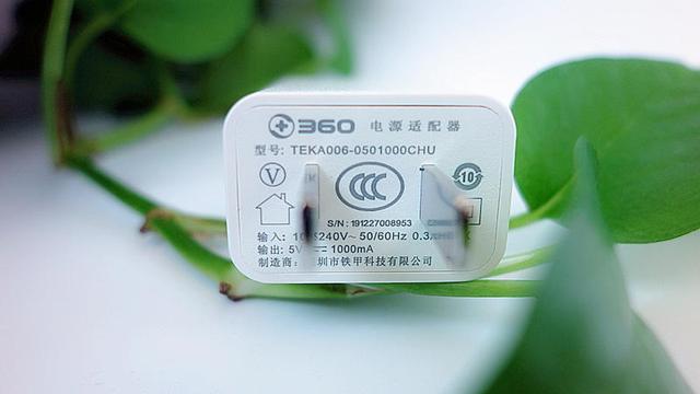 电源适配器为360设备的通用充电器,电气参数印制在插头处,型号、SN码、5V1A充电参数等一应俱体。