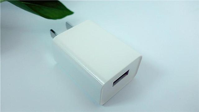 电源适配器外壳为白色塑料,长方体造型,前端为标准的两项插头,后端为通用的USB插孔,是符合国标的电源适配器,搭配标准充电线,既可为360摄像机供电,还可为手机、平板等设备充电。