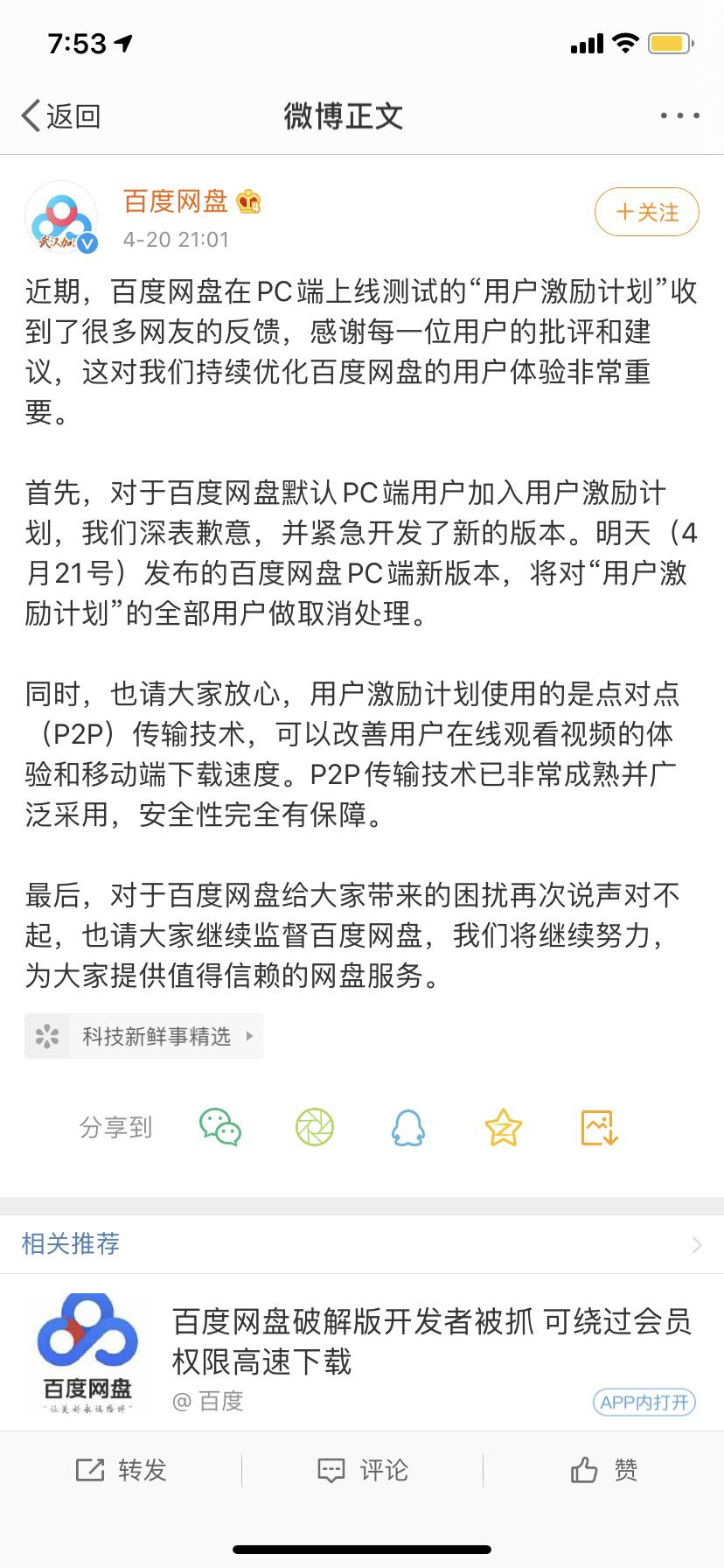 4月20日晚间,百度网盘官方微博发文表示,对于百度网盘默认PC端用户加入用户激励计划,我们深表歉意,并紧急开发了新的版本。4月21号发布的百度网盘PC端新版本,将对“用户激励计划”的全部用户做取消处理。