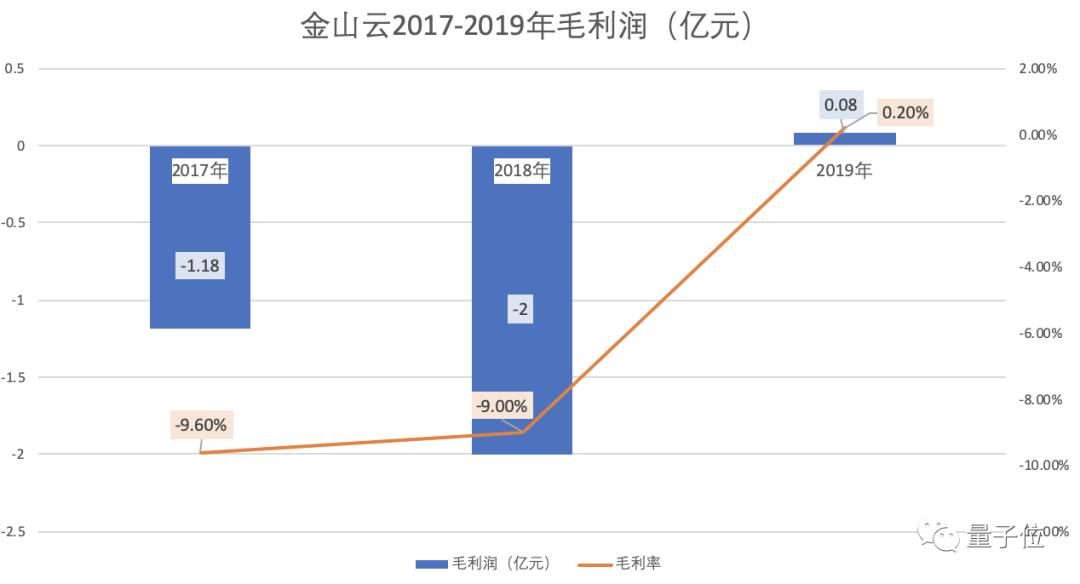 2019年,金山云实现770.9万元的毛利润,毛利率由负转正,为0.2%,摆脱了只要提供服务就亏钱的境地。