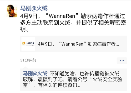 4月9日下午,火绒安全创始人马刚在微信朋友圈发表动态称:“4月9日,‘WannaRen’勒索病毒作者通过多方主动联系到火绒,并提供了相关解密密钥。”连马刚自己也笑称不明白对方为何会主动提供。
