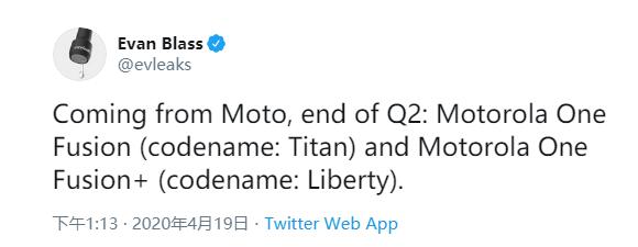 CNET称,在19日午间,境外社交平台知名“大V”Evan Blass爆料称,摩托罗拉即将发布两款入门级智能手机新品,分别是“Moto One Fusion”和“Moto One Fusion+”。两款机型的代号分别为“Titan”和“Liberty”,主打入门级市场,或将于第二季度末在印度和美国市场推出。
