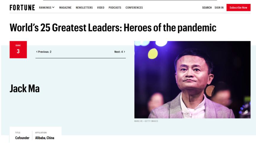 刚刚,美国《财富》杂志发布了年度全球最伟大的25名抗疫领袖,向抗击疫情的世界英雄致敬。全球多名企业家入选,马云位列第三,比尔盖茨位列第十。