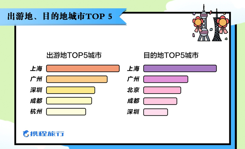 目前,客源地排名前十的城市,依次为上海、广州、深圳、成都、杭州、南京、北京、重庆、西安、长沙;而排名前十的目的地依次为:上海、广州、北京、成都、深圳、杭州、南京、西安、重庆、长沙。
