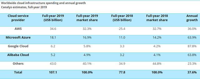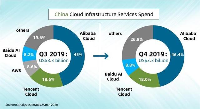 目前云计算已经成为阿里巴巴增长最快的业务之一,去年第四季度收入同比增长62%,至107亿元人民币,占总收入的7%。该数字在过去5年增长近30倍,是中国唯一单季度实现百亿级收入的云服务商。据Canalys数据,截止2019年第四季度,阿里云在中国市场排名第一,且市场份额环比上涨至46.4%。