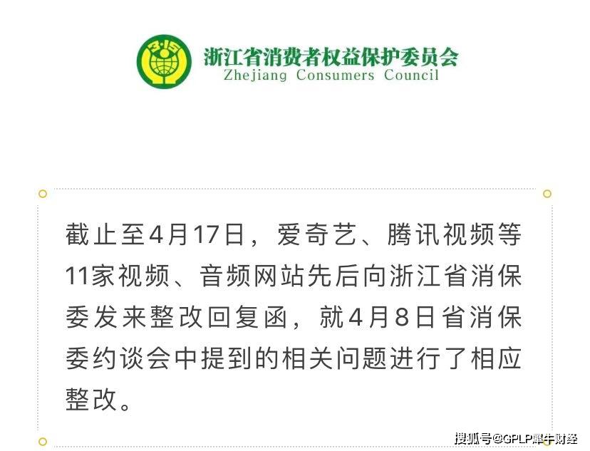 4月20日,浙江省消费者权益保护委员会(以下简称“浙江省消保委”)宣布了4月8日召开的关于爱奇艺腾讯等11家音视频平台的座谈会的整改结果。
