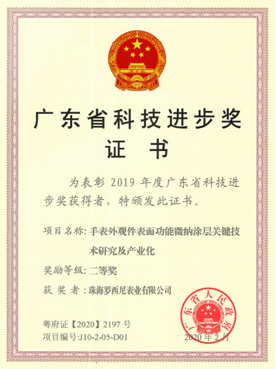 罗西尼凭借其主导的产学研项目《手表外观件表面功能微纳涂层关键技术研究及产业化》成为2019年度广东省科学技术奖中唯一一家获奖的钟表企业。