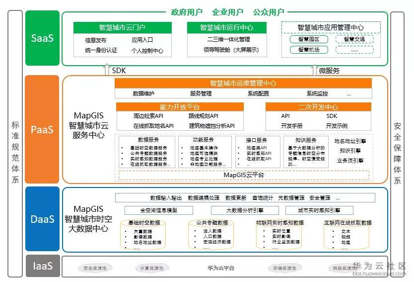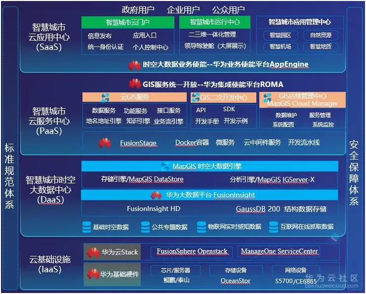 01.MapGIS智慧城市云平台V10.3技术架构先进完整,基于华为云基础设施,构建时空大数据中心,为政府、企业及公众用户提供时空信息服务。