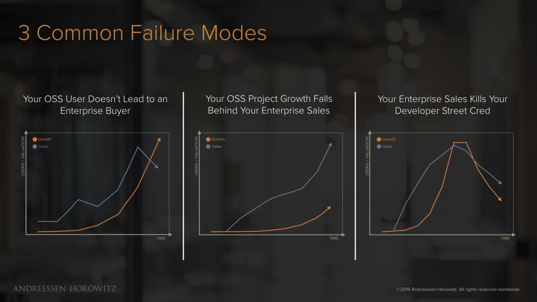 第二种失败类型,你的开源项目发展落后于企业销售。这种情况下,你的产品—市场契合度可能不怎么好看。第三种失败,是商业产品毁掉了你在开发者社区的信誉。可能的原因是专有代码过多,而开源代码不足,以至于开源项目进入消亡阶段。