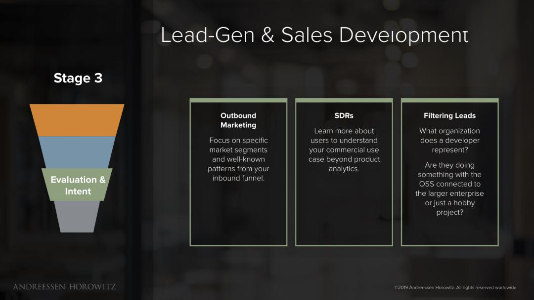 开源漏斗的下一阶段是评估和意图,即验证和优化潜在业务拓展与业务开发的有关理论。目的是找到从用户到企业购买者的路径,由销售合格线索(SQL)加以衡量。