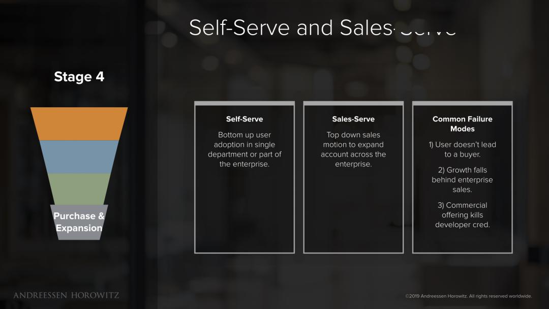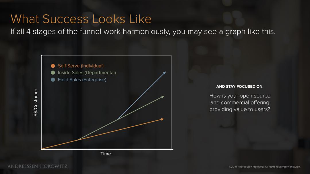 最后,基于你的产品特性,你可能只有自助服务或只有内部销售的方式。这没关系,毕竟销售确实要取决于产品的复杂性,以及在哪里、如何最好地发挥它的价值。我确实发现,大多数开源公司采用的是某种自上而下与自下而上销售的结合体,通常从下至上开始,然后打造自上而下的销售以扩大收入。