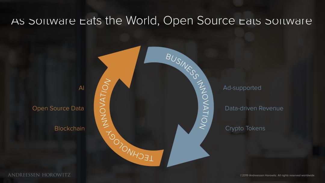 未来,这一良性循环将持续发酵。技术方面,人工智能、开源数据和区块链是新兴技术的典型例子。下一代商业模式可能包括支持广告的开源软件(如大型专有企业所支持的开源项目)、数据驱动的收入以及数字加密通证,后者通过区块链可以实现货币化。