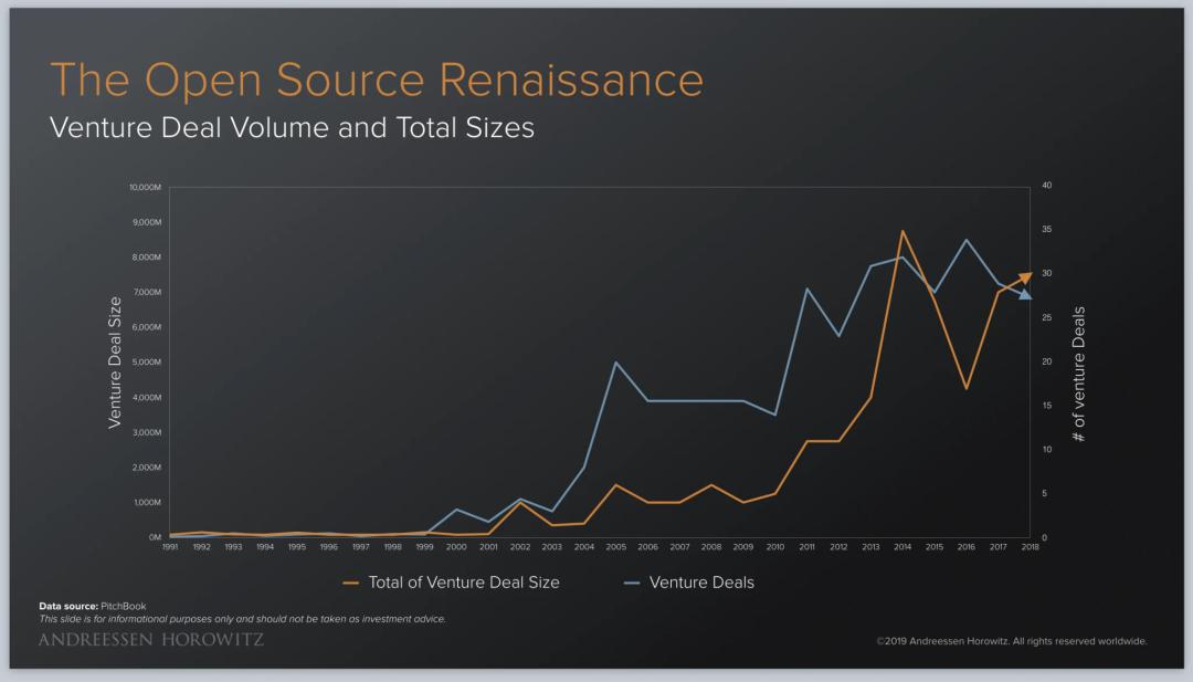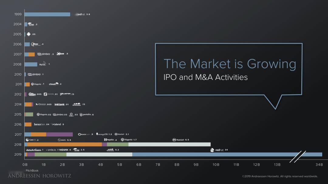 但是,看看最近几年又发生了什么?Cloudera、MongoDB、Mulesoft、Elastic、GitHub……有多少家开源公司都实现了价值数十亿美元的 IPO 或并购交易!当然,还有 RedHat——1999 年,它 IPO 时的市值是 36 亿美元;今年(原文写作于 2019 年,编注),它卖给 IBM 的价格则高达 340 亿美元。未来,我会非常高兴看到设下更高标杆的新玩家出现。