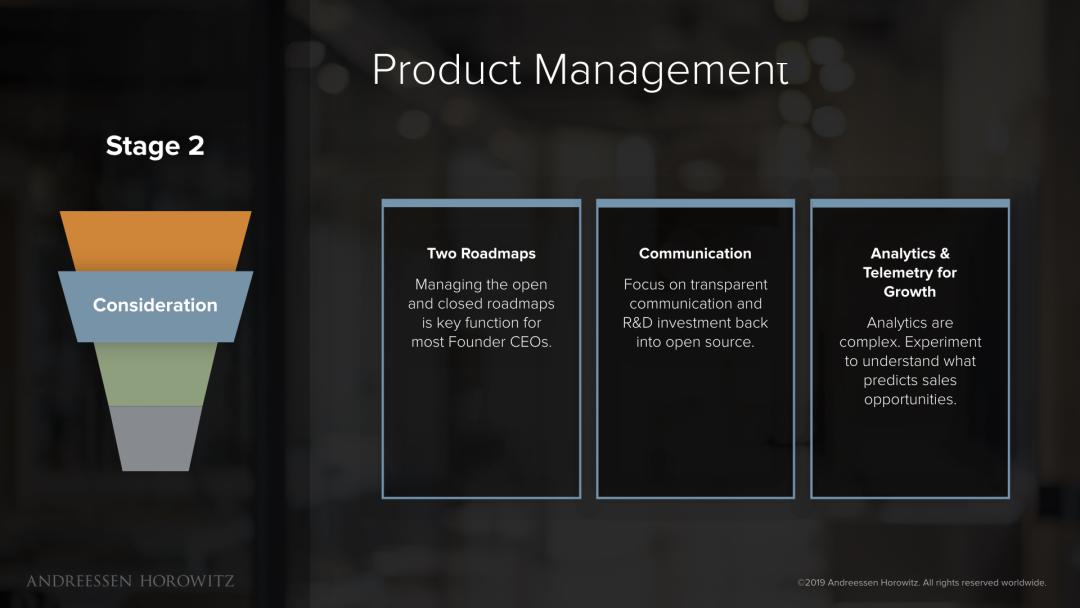 有效的产品管理将执行许多功能来支持这一阶段的发展:管理闭源和开源产品路线图,同开发者和用户沟通决策,并为产品构建分析功能以收集更多有关使用模式的信息,进而预测销售机会。