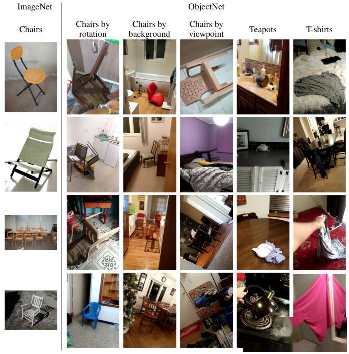 ImageNet与现实对比:在ImageNet(左列)中,对象放置整齐,处于理想的背景和光照条件下。而现实世界比它混乱得多(资料来源:objectnet.dev)