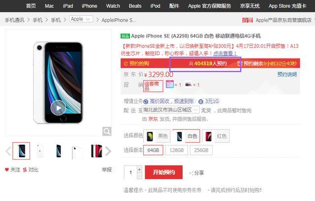 京东目前在售的iPhone SE依然保持了3299元起的原价,但是平台也推出了一项“保值换新”计划,抢购iPhone SE的用户可以享受全额折抵换购下一代iPhone的活动。可以看到,短短几日预约抢购的人数已经突破了40万人。