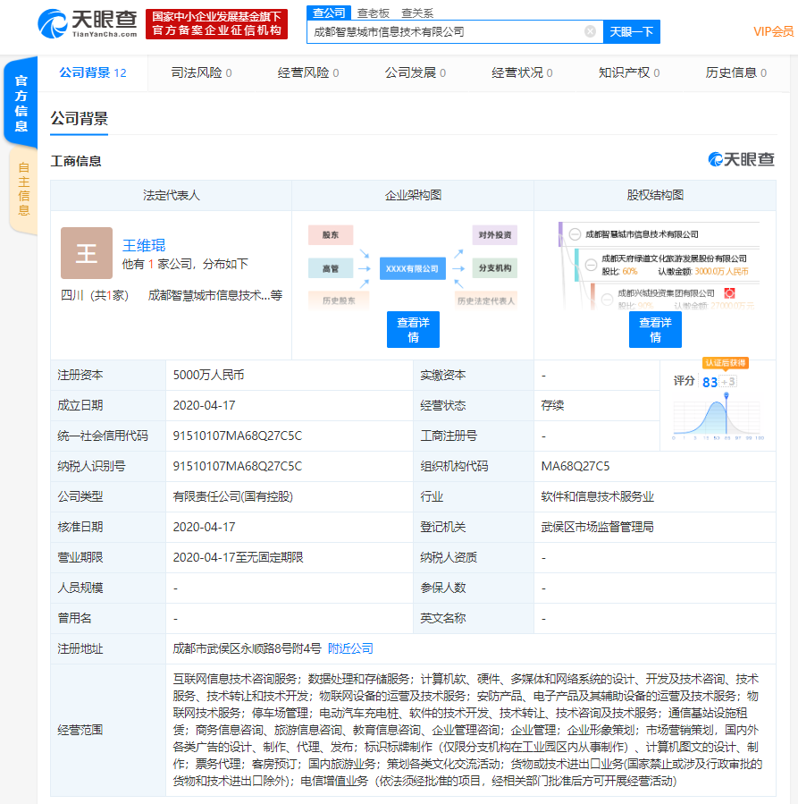 【环球网综合报道】天眼查数据显示,4月17日,成都智慧城市信息技术有限公司成立,该公司注册资本5000万人民币,法定代表人为王维琨,公司经营范围包括电动汽车充电桩、软件的技术开发、技术转让、技术咨询及技术服务;停车场管理;物联网设备的运营及技术服务;国内旅游业务;策划各类文化交流活动等。