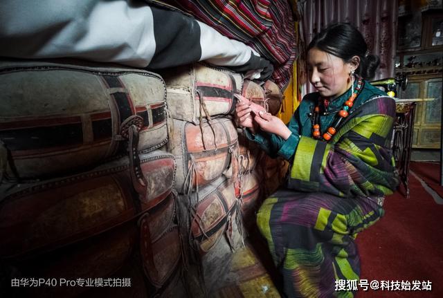 17岁的藏族姑娘曲云错,正在整理自家糌粑囊袋的细节,也被真实还原出来。华为P40 Pro在专业模式下可调整曝光、快门速度、白平衡、焦点锁定,顺利完成复杂室内暗光条件下的拍摄及色彩还原。