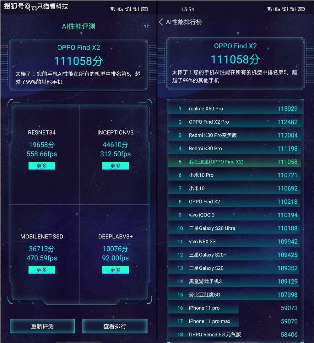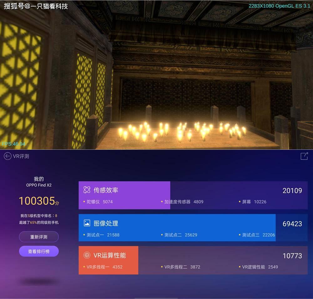 在AI性能处理评测方面受到LPDDR4X与LPDDR5、UFS3.0与UFS3.1之间的性能上的细微差异,最终测试得分排行位居第5;在VR效果评测中评级S,根据VR评测画面提示来看,OPPO Find X2在VR体验过程中存在一定的不稳定偏移情况。不过作为非游戏旗舰手机而言,能够在VR体验中获得第八名也是相当给力了,根据排行榜机型来看OPPO Find X2输在软件优化上。在3D跑帧测试中,游戏帧率保持在38-52Fps之间,在高画质下平均帧率可达44Fps,配合120Hz的插帧补偿在评测演示游戏能够获得非常流畅的画面输出。