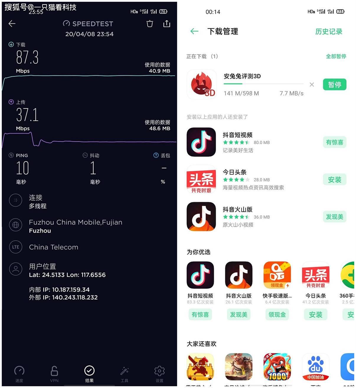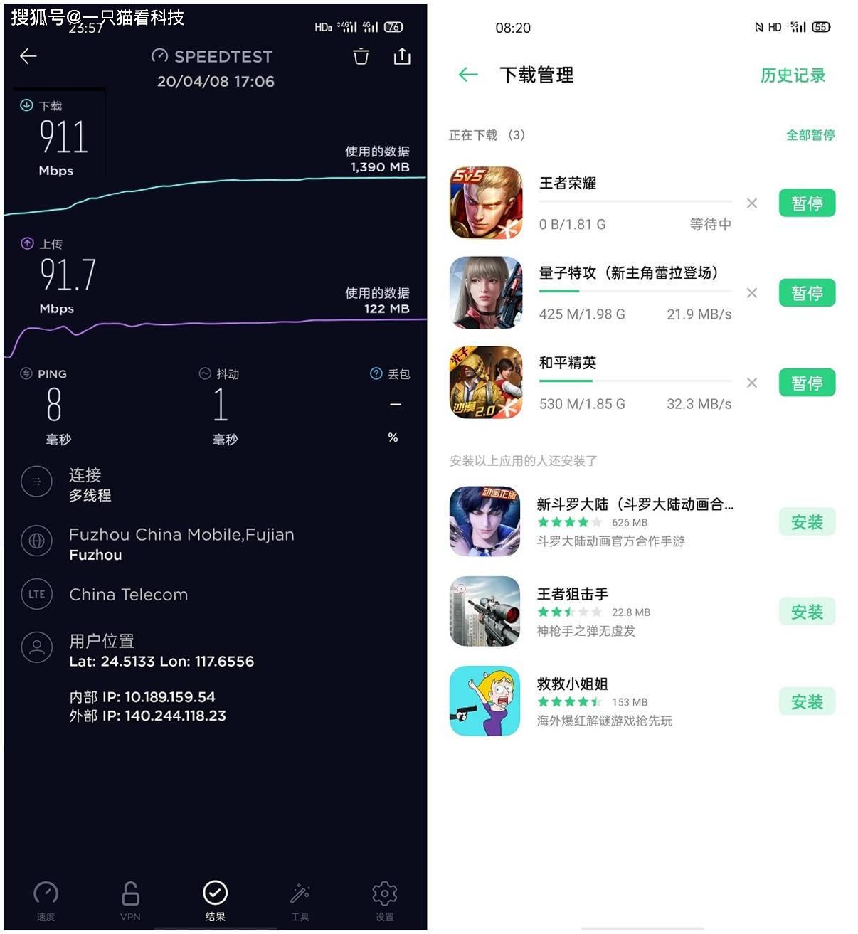 为了能够更为清晰的了解4G与5G在这款手机上速率上的差别,笔者特地找同事借来了5G套餐的手机卡对速率以及流量下载速度的对比。虽然根据官方介绍,在OPPO Find X2的5G外挂基带在频段上有所阉割,但在实际体验中速率上并没有受到太大影响。上G的游戏文件,咻咻的一下即刻完成下载任务,相比4G网络快了不是一星半点。通过两组5G与4G测试图片可以非常清楚两者之间的速度是差别。