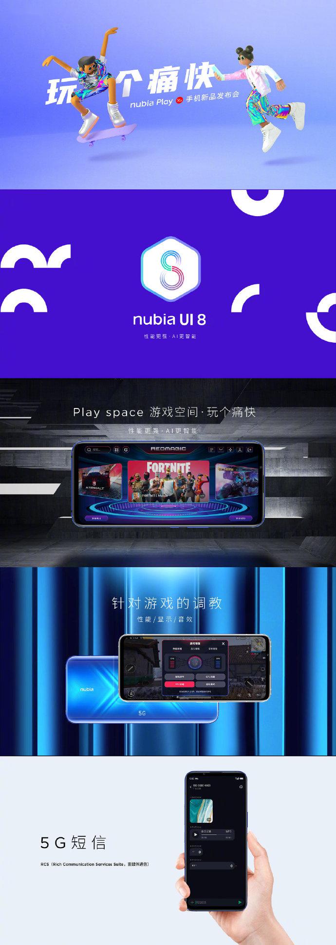 努比亚Play 5G手机采用全新升级的nubia UI 8.0系统,搭载Play Space游戏空间,在游戏性能、显示和⾳效上,针对不同类型的游戏做了专⻔的调教,性能更强,AI更智能。