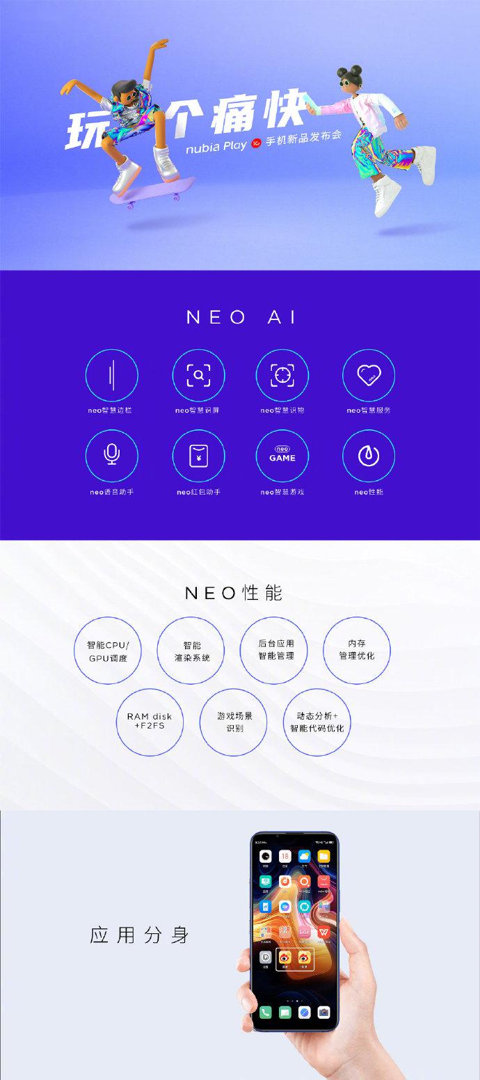 努比亚Play 5G手机 nubia UI 8.0搭载NEO AI,拥有应⽤分身、智能边栏、智慧识屏、智慧服务等功能,就像你的贴⼼智能助⼿,24⼩时陪伴你。neo性能,可以根据应⽤、游戏场景、CPU、GPU、内存等智能调度,让性能响应更加及时,帧率更稳定。支持5G短信,可以(群)发送⽂字、图⽚、⾳视频等文件。