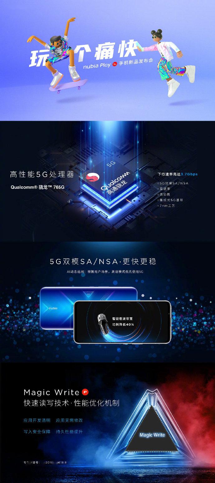 IT之家获悉,努比亚Play 5G手机搭载了⾼通骁⻰765G处理器,支持5G双模NSA & SA ,下行速率高达3.7Gbps,还支持努⽐亚独创的MagicWrite快速读写技术,快上加快。