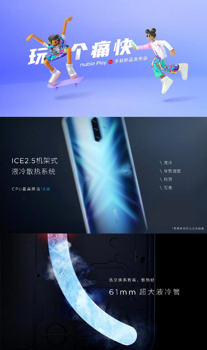 努比亚Play 5G手机搭载ICE2.5机架式液冷散热系统,以61mm超大液冷管为核心,配以导热石墨、凝胶、铜箔等多种散热材料,最⾼可为CPU降温16度,保证持续高性能输出,带来更佳的游戏体验。