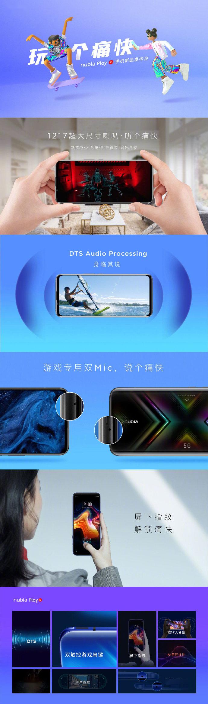 努比亚Play 5G手机搭载了1217超⼤尺⼨扬声器,加上DTS⾳效加持,立体声、大音量让你身临其境。游戏专用双Mic,握持不遮音;全新光感屏下指纹,又快又安全。