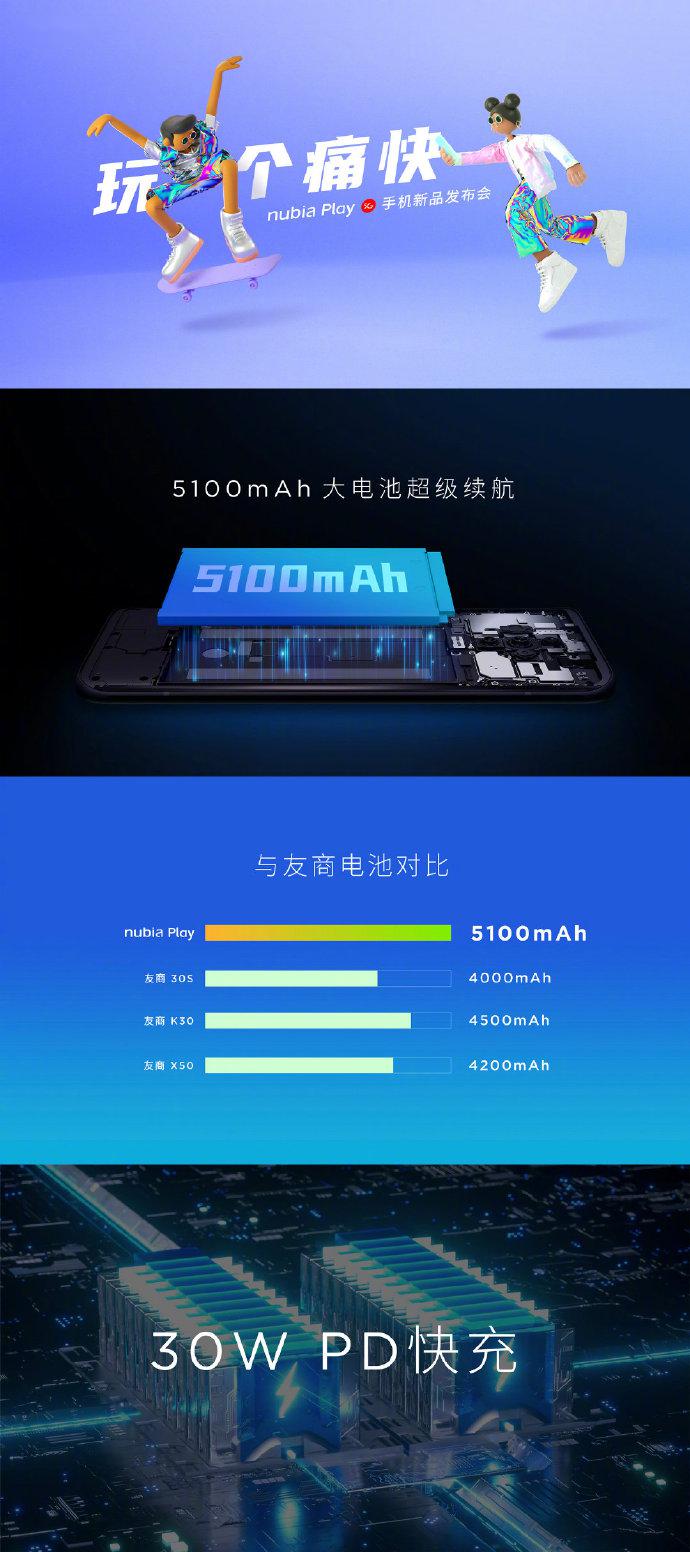 努比亚Play 5G手机搭载5100mAh超大电池,搭配30W PD快充,⽀持PD3.0、QC4.0、PPS等协议,让你尽享超强续航体验。