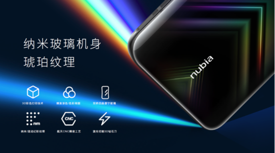 努比亚Play的摄像头采用了菱形的几何设计符号,标识性十足又与机身整体的设计语言相呼应;机身背部则采用了强韧而细腻的纳米玻璃材料,并以3D彩色打印技术巧妙地呈现了琥珀纹理般惊艳的观感,用户使用过程中配合自然光影流转在机身上的效果,美轮美奂且极富个性。细节上,努比亚Play以极具品牌特色的红黑元素作为点缀,突出了未来感与科技感。