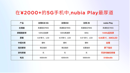 高刷新率屏幕作为近两年手机行业军备竞赛的重要赛道,是用户与手机交互的第一窗口亦是努比亚的优势领域:行业首款配备90Hz高刷新率屏幕产品的红魔3,全球唯一搭载144Hz超高刷新率的红魔5G都是手机屏幕行业史的里程碑。此次努比亚Play 5G手机在功能上对同级别产品的降维打击延续至屏幕,搭载了广受用户好评的144Hz刷新率AMOLED超竞屏!此外还有同类产品都不具备的双触控游戏肩键,为用户提供畅快淋漓的游戏体验。