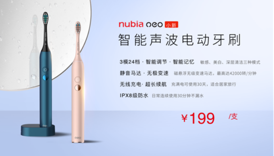 本次nubia neo(努比亚小新)推出的第一款个护产品是nubia neo智能声波电动牙刷,其具有3模24档智能调节,可智能记忆敏感、美白、深层清洁三种模式,自动根据用户偏好选择更适合的模式,省心又省力;同时具有IPX8级防水等级,日常连续使用30分钟不漏水;并且支持无线充电,续航也非常强劲,一次充电可使用30天,无论家居和旅行都能保障用户的牙齿健康。