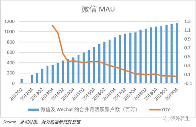 2014年后,微信用户同比增长一路骤跌,Q1同比增长还超过120%,Q4就已接近30%。如此迅速的下跌,意味着用户增长已经完成冲刺,这个引擎需要下一棒接力。