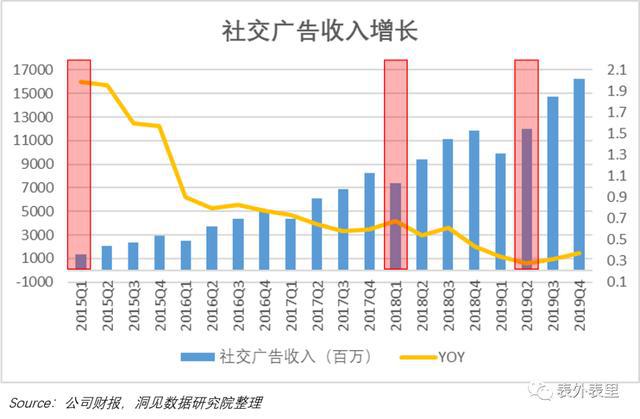 第二棒加载率引擎为企业带来的增长,明显地表现在其广告营收中。2015Q1,推出第一条朋友圈广告当季,社交广告营收同比增长199%;2018Q1,第二条朋友圈广告推出,社交广告营收增长出现小波峰;2019Q2,第三条广告的推出似乎并没有带来增长刺激,这是因为当时宏观供应过剩,整个广告市场库存较高,对其收入产生影响。