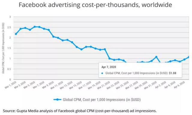 以Facebook为例,3月新冠疫情逐渐严重以来,其CPM广告价格就在不断下跌。这背后是广告主预算的下降,整个广告行业的库存越来越大,即便广告效果再牛的企业,也必须照顾金主预算,下调广告价格。