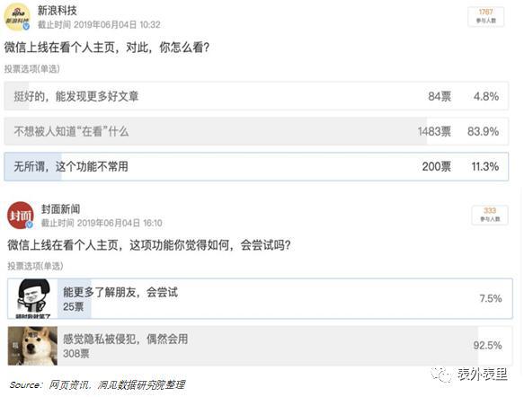 此时,官方对微信的任何细节改变都会引起很大的舆论反应。比如2019年初微信上线“看一看”功能,很多人认为被侵犯到了隐私。在媒体发起的投票中,八成以上的人都不想被朋友知道自己在看什么。