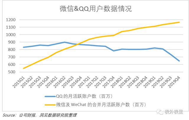 2011年,随着3G手机的出现,微信顺势推出。推出后以免费发短信、打电话迅速吸引用户。其MAU在2016Q4达到8.8亿人次,首次超过QQ,此后差距越拉越大。