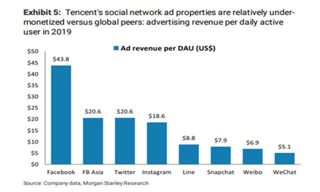 2019年,微信每DAU贡献的广告收入仅为5.1美元,相比之下,Facebook是其8.6倍、微博是其1.35倍。单从这个数据来看,微信似乎有着巨大的现金池有待挖掘。