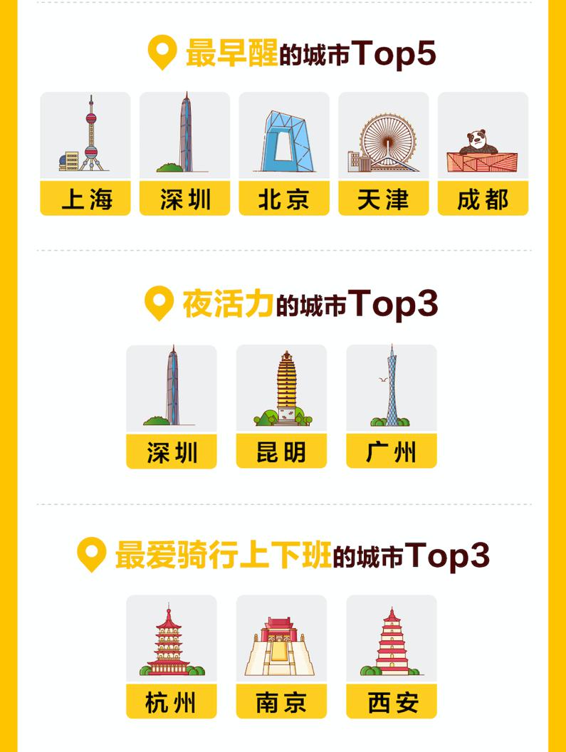 “骑迹焕活城市”报告显示,3月以来,全国主要城市的骑行早晚高峰恢复正常,其中上海、深圳每天“醒”得最早,早高峰从清晨5点开始,北京、天津、成都紧随其后,早高峰始于6点;杭州、南京、西安的早晚高峰骑行用户占比最高,成为自行车轮上的复工城市;深圳、昆明、广州因深夜和凌晨骑行人数占比高于其他城市,成为骑行“不夜城”;值得一提的是,最早“醒”的深圳同时也最晚“睡”,是“焕活力”最强的城市。