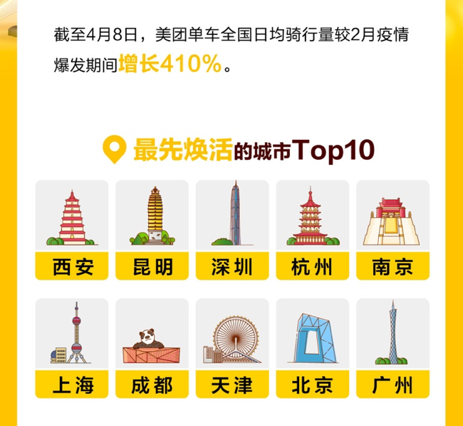 报告显示,截至4月8日,美团单车全国日均骑行量较2月疫情爆发期间增长410%。焕活最快的城市前十位分别为西安、昆明、深圳、杭州、南京、上海、成都、天津、北京和广州,其中,西安的美团单车骑行数据在3月底便已完全恢复至疫情前水平,昆明、深圳、杭州也于4月8日前回归正常。