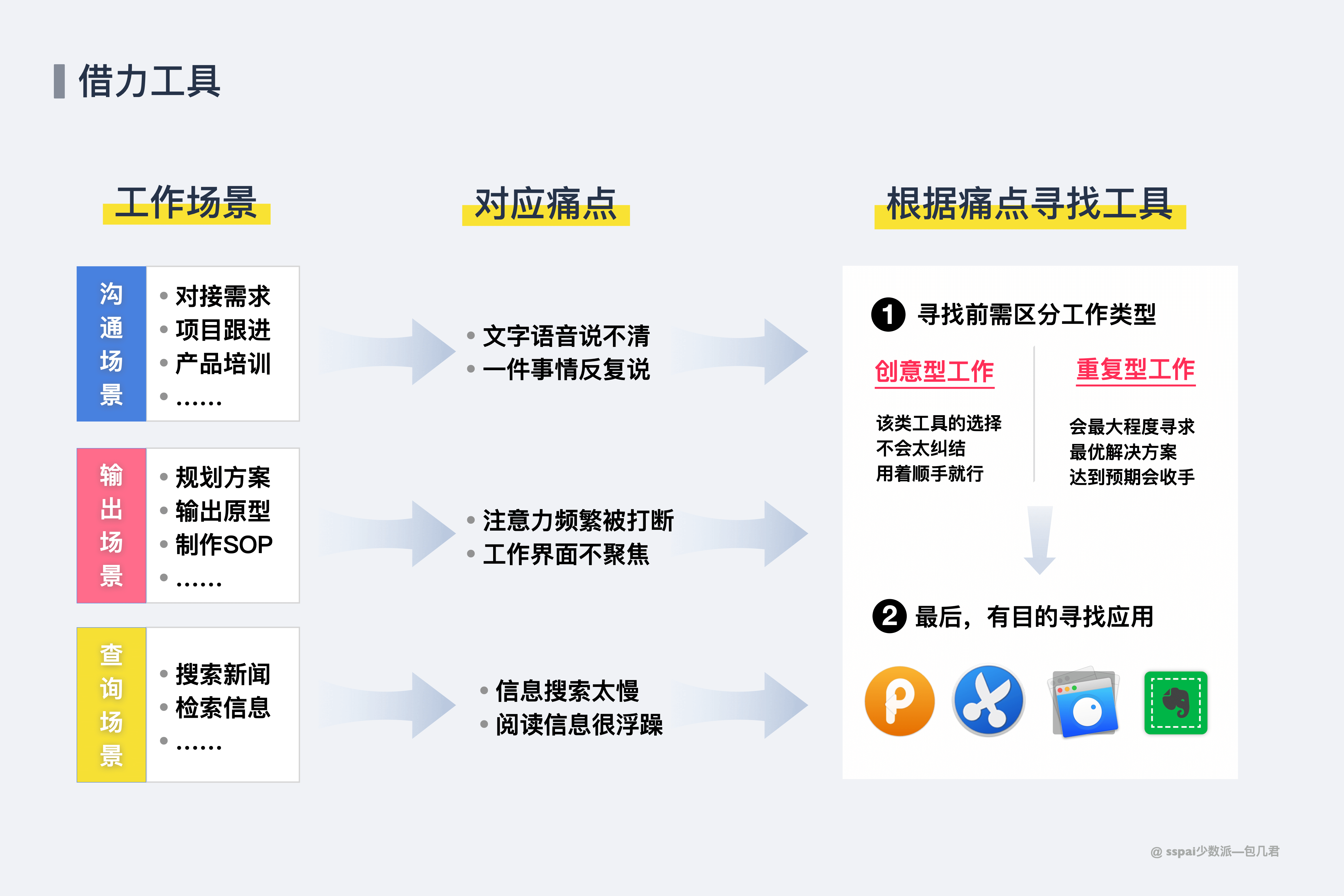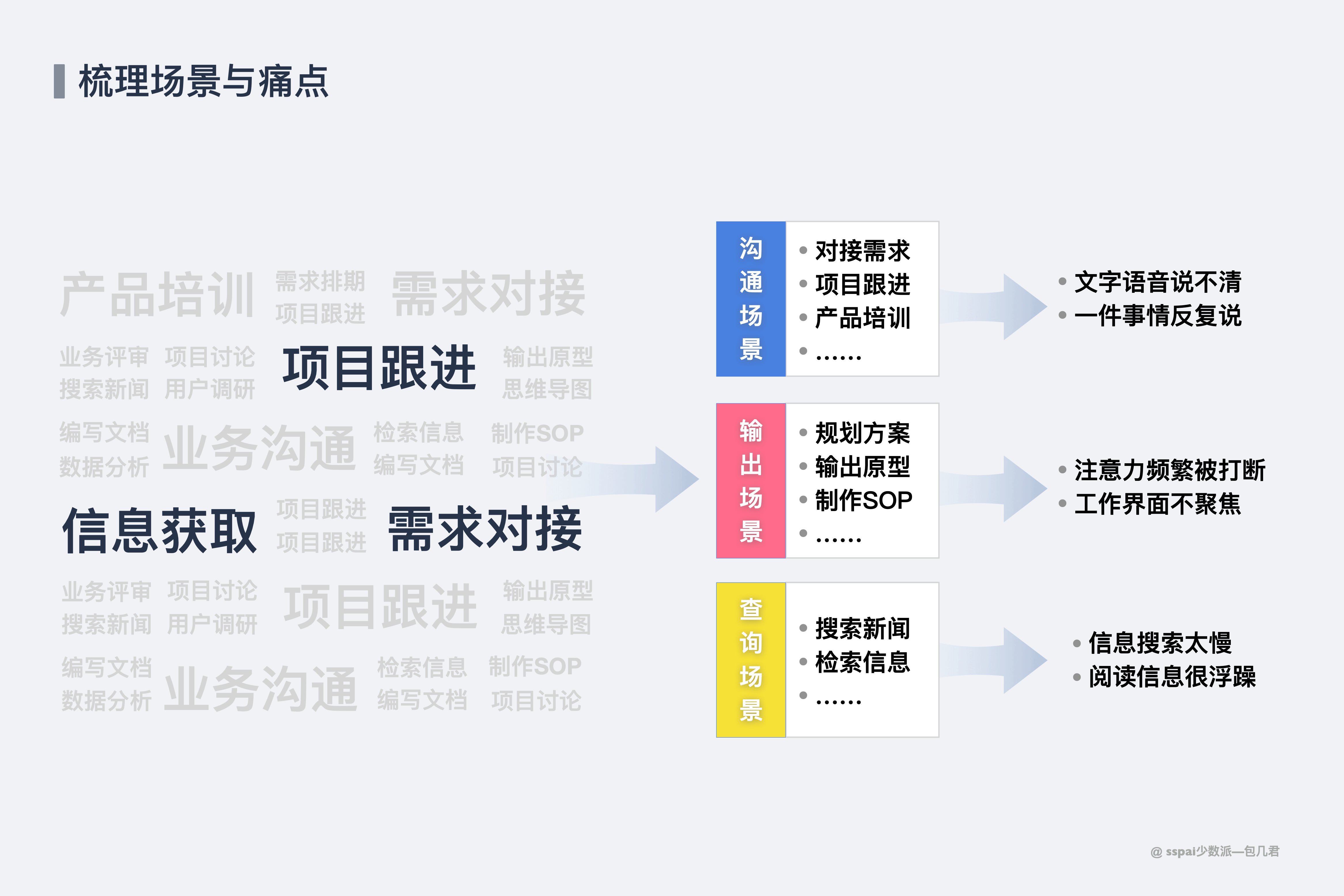 知道自己的工作场景后,再深入思考这个场景是否有反复遇到的问题,比如自己在以下场景分别存在的痛点