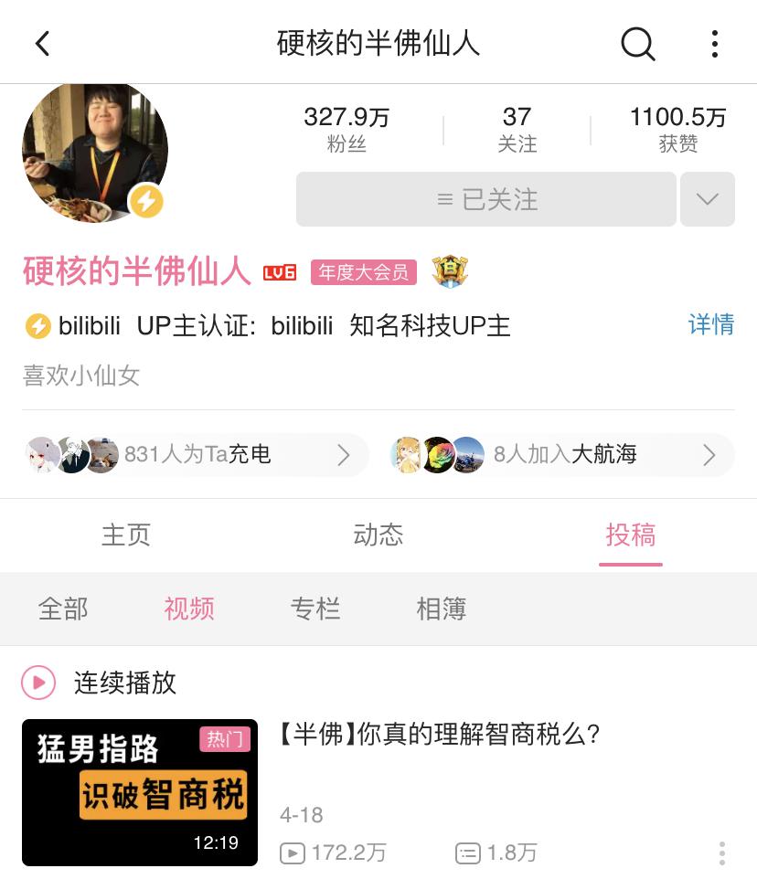 以知名up主半佛仙人为例,截至本月20号,有830人为其充电,更早入驻的进入TOP10的up主老番茄的充电人数则近2300人。