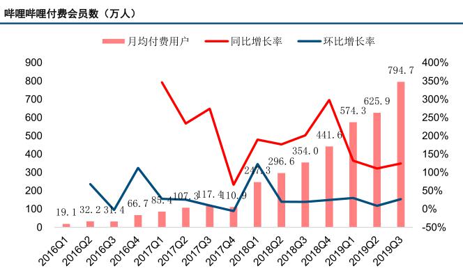 截止2019Q3,B站正式会员数达到6200万人,到2019Q4,正式会员数达6800万,同比增长50%。正式会员快速增长的同时,付费会员在2019Q3达到794.7万人,同比增长124.5%,增长潜力巨大,渗透率在稳步提高。