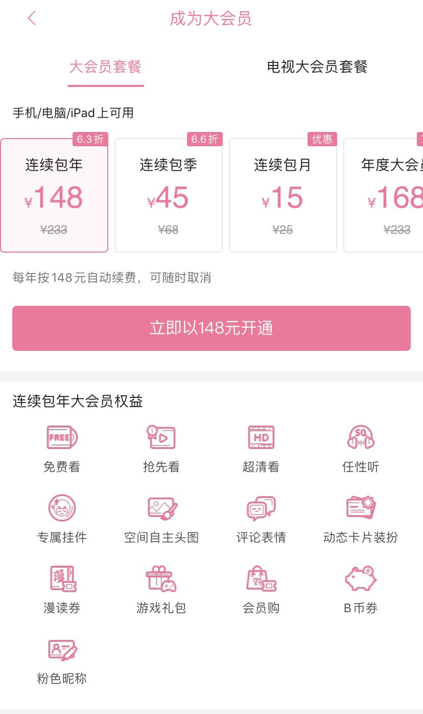 1)内容特权:付费内容免费观看、抢先观看、视频超清画质、每月赠送漫画阅读券;