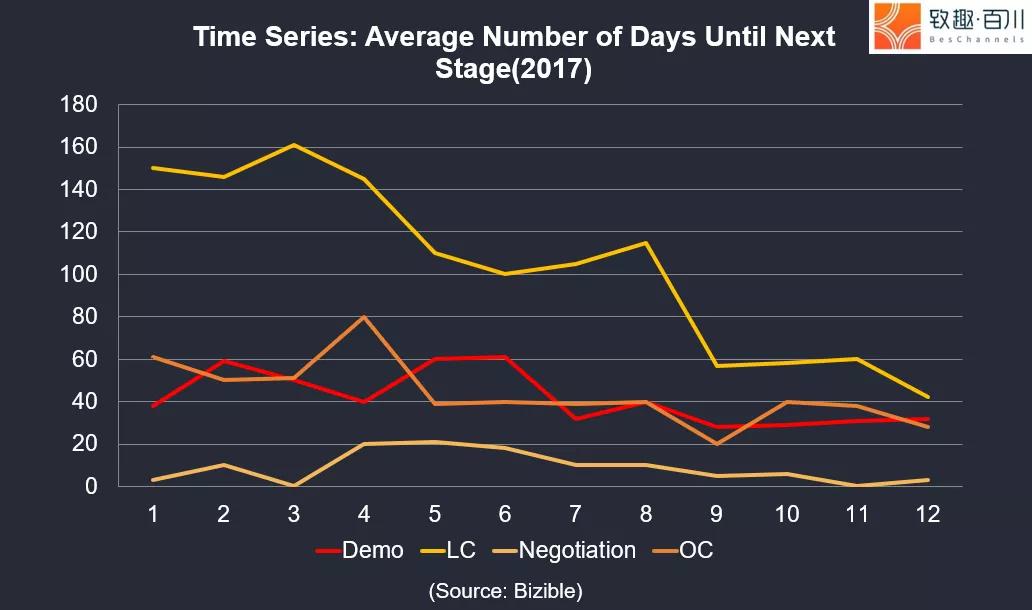 行指每个阶段,因此您可以看到到过渡到下一个阶段的平均天数。这条线指的是从LC到下一阶段的平均速度,也就是演示阶段。
