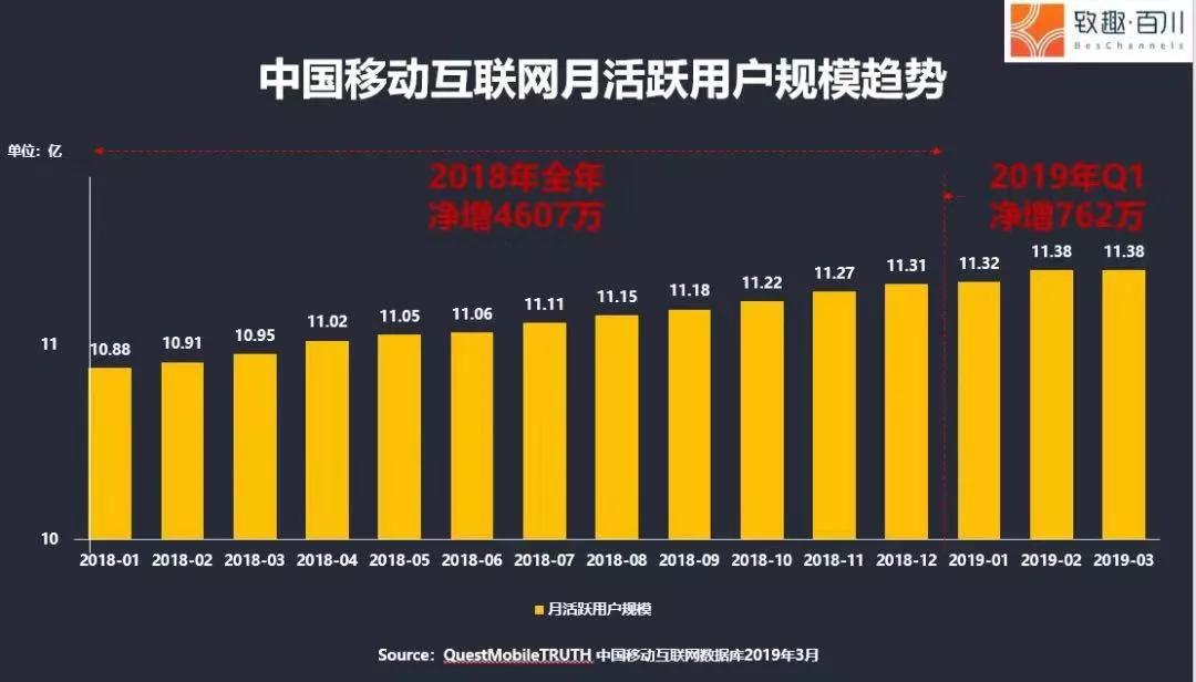 同时,用户增量已经见顶。QuestMobile数据显示:1季度的移动用户净增量仅有762万,同比增速首次跌至4%以下 。